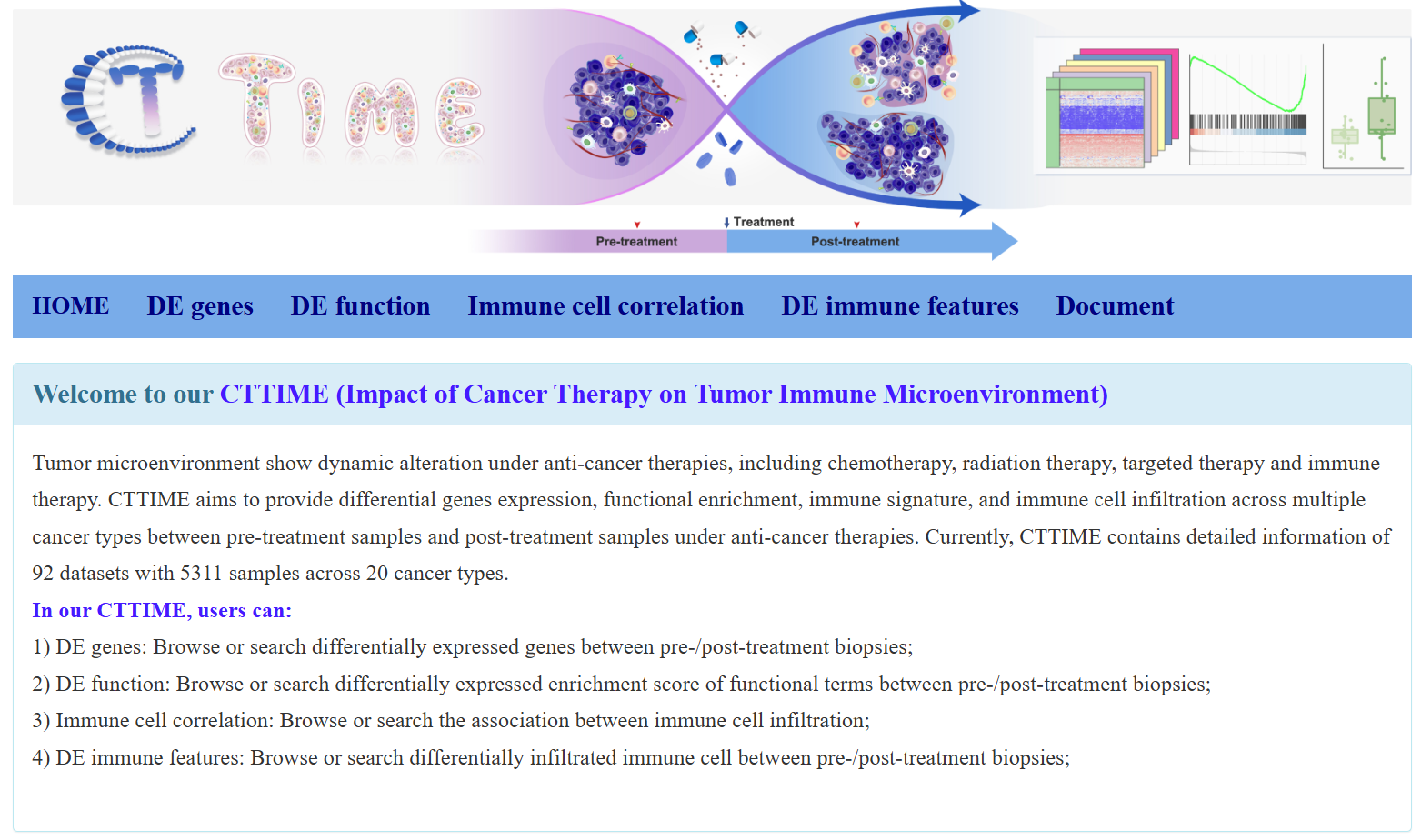 CTTIME (Cancer Therapy’s Impact on Tumor Immune Microenvironment) is designed to identify dynamic molecular profiles under various anti-cancer therapies. This database comprised 92 transcriptomic datasets, including 5311 pre- and post-treatment biopsies from 20 cancer types and 9 treatment strategies. It includes four modules: DE gene, DE function, Immune cell correlation. DE immune features.